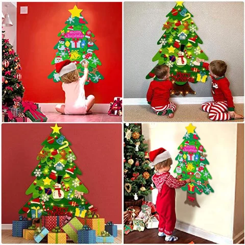 Felt Christmas ornaments kits with many different decorations are popular on social media. Removable decorations offer endless possibilities. Kids DIY Christmas tree wall at New Year, learn how to decorate a Christmas tree and creative DIY decorative effects. Curiosity lets children immerse in it and grow in confidence.